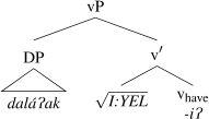 The structure of this paper is as follows. In Sect. 2, we lay out relevant background contrasting previous views on the nature of property concept root meaning. In Sect. 3 we present the empirical overview of property concept word formation in Wá⋅šiw. In Sect. 4 we present our analysis of two possible property concept root types in the language: those that denote relations between individuals and states, and those that denote sets of states alone, of which only the latter require possessive morphology in order to act as predicates of individuals. In Sect. 5 we extend our analysis to the most complex type of property concept formation in the language (8), offering evidence to support our view from the behavior of property concept roots in resultative bipartite verbs (Jacobsen 1980). In Sect. 6 we make more explicit our morphosyntactic analysis of possessive predication in the language and develop an analysis in which -iʔ is a functional, categorizing light verb vhave. Section 7 concludes and situates our findings within a broader theoretical context.