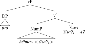 As expected on such an analysis, and consistent with Francez and Koontz-Garboden’s findings, –iʔ is implicated in ordinary possession elsewhere in the language as what Jacobsen (1964:555) terms the ‘attributive-agentive’ suffix, which he describes as a denominal verbalizer that “derives verbs expressing the possessor of the underlying noun.” Jacobsen’s description arises from the fact that this suffix is used productively to express ordinary possession, as in the following: