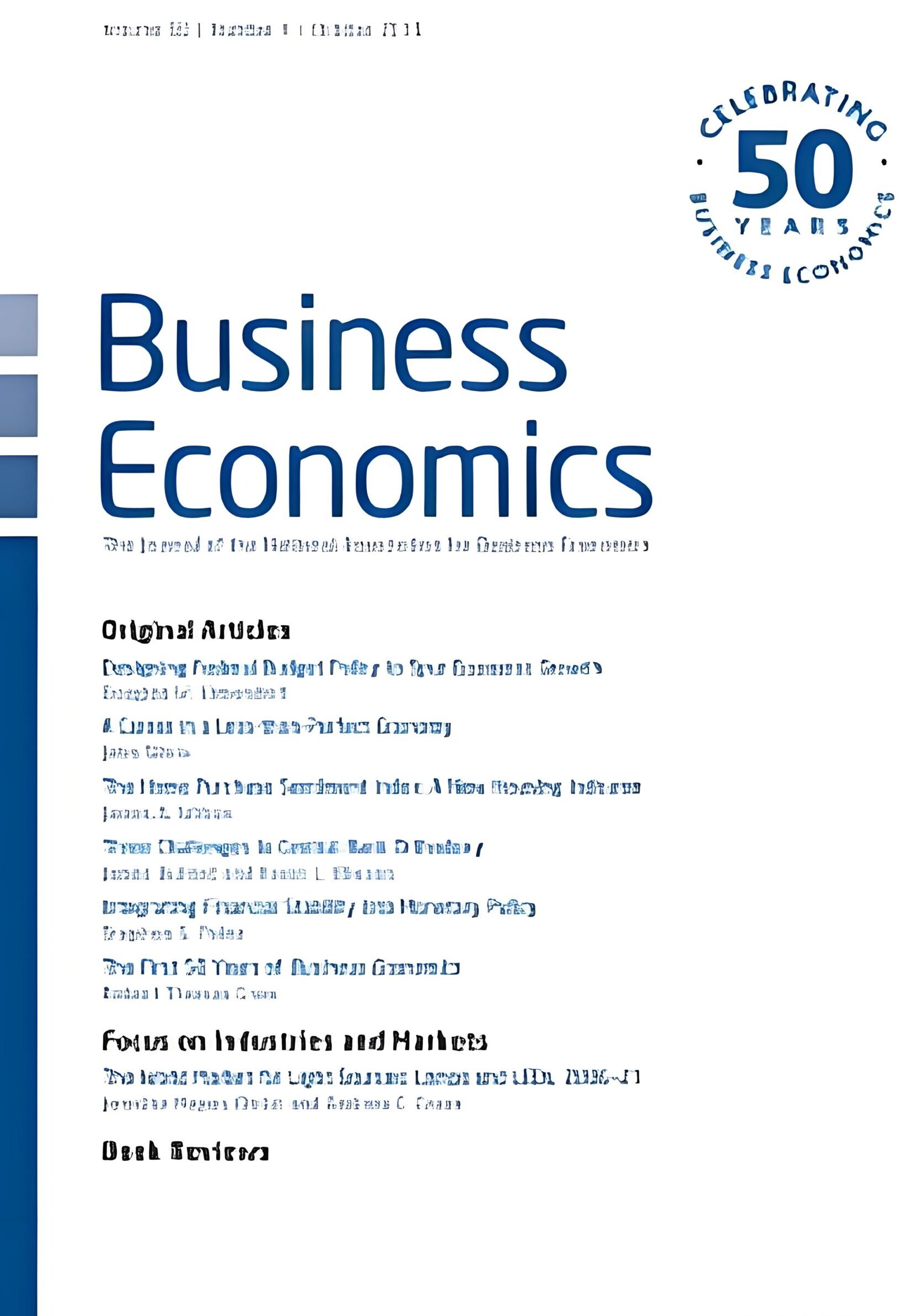 Business Economics is the official journal of the National Association for Business Economics (NABE).It features peer-reviewed articles written by academics, policy-makers, and professionals in commerce,offering practical insights on how economics is applied in business environments.The journal provides a lively forum for debate on critical business issues, showcasing best-practice models,tools, and techniques from industry experts. It also interprets current economic information in a usefuland educational manner for professionals.Regular feature sections include: Focus on Statistics, Focus on Industries and Markets,
